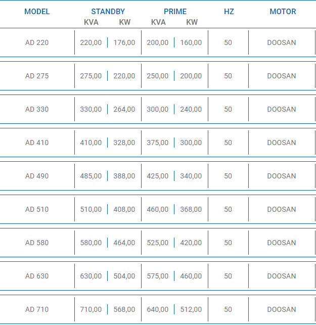Máy phát điện Aksa động cơ Doosan là sản phẩm có động cơ xuất xứ Hàn Quốc với các ưu điểm như: Động cơ Doosan Hàn Quốc, hoạt động bền bỉ, máy khỏe, với dải công suất 60KVA – 750KVA.